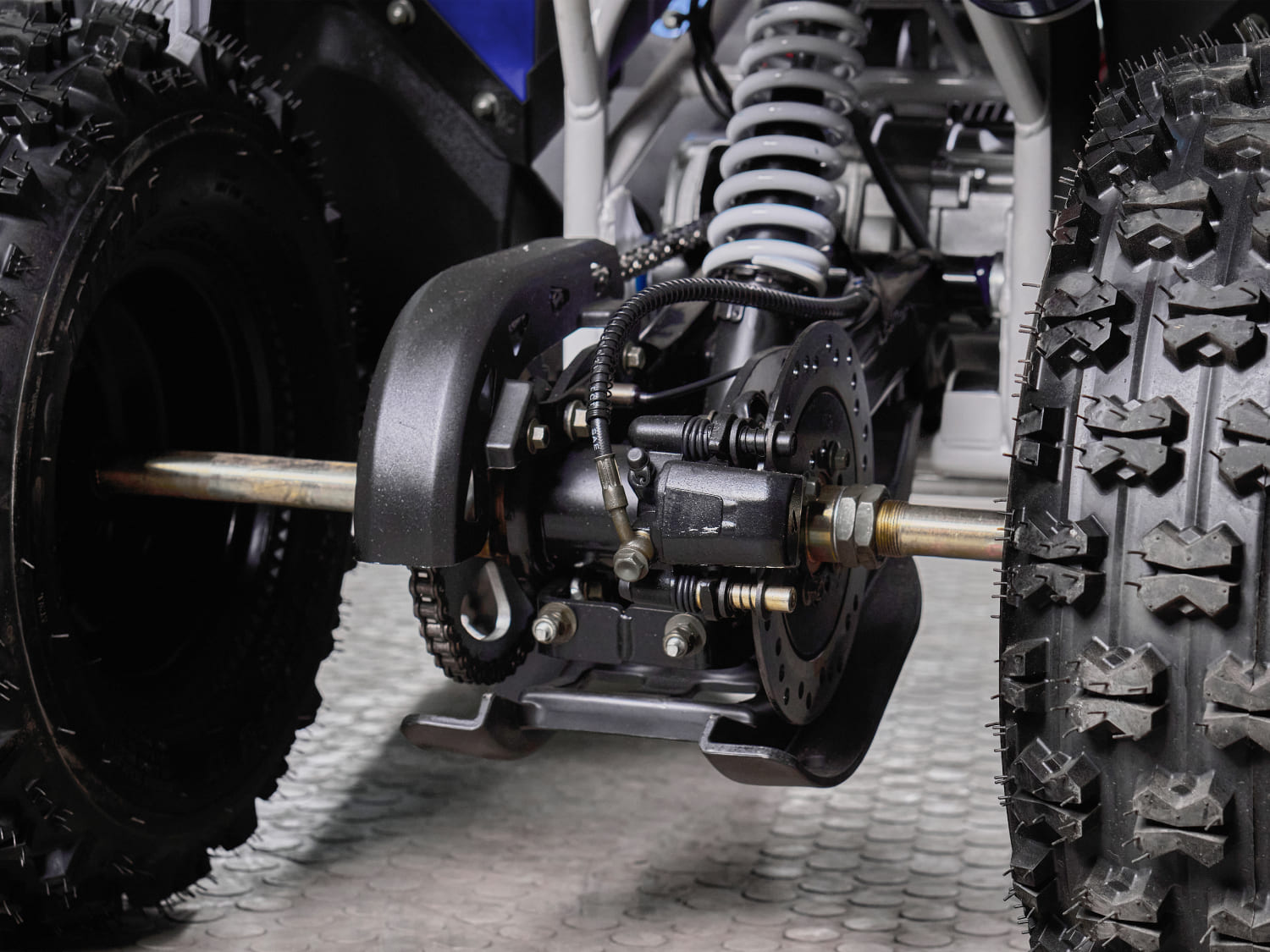 Шасси Sharmax 180 CROSS RX оснащено независимой передней подвеской с двойными А-образными рычагами и маятниковой задней подвеской с моноамортизатором, обеспечивающими комфортное управление и отличную устойчивость. Ход передней подвески составляет 120 мм, а задней – 180 мм. Квадроцикл оборудован газомаслянными передними амортизаторами и моноамортизатором на задней оси. С максимальной скоростью 65 км/ч, он идеально подходит для активного отдыха.